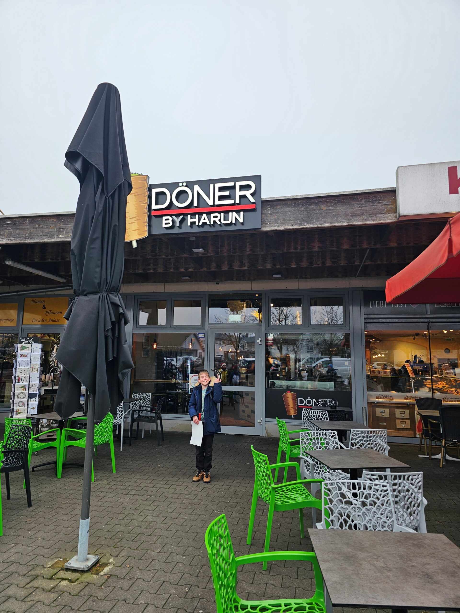 Nach dem Film sammelten wir unseren Müll ein. Danach machten wir ein Klassenfoto zusammen. Schließlich machten wir uns auf dem Weg zur Bahn. Auf der Hälfte des Weges sah Frau Jung einen Döner-Laden, der so hieß wie ein Mitschüler aus unserer Klasse. Der Dönerladen hieß „Döner bei Harun“!