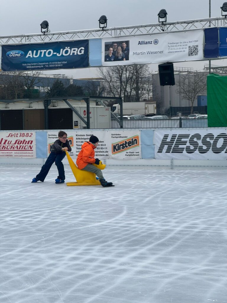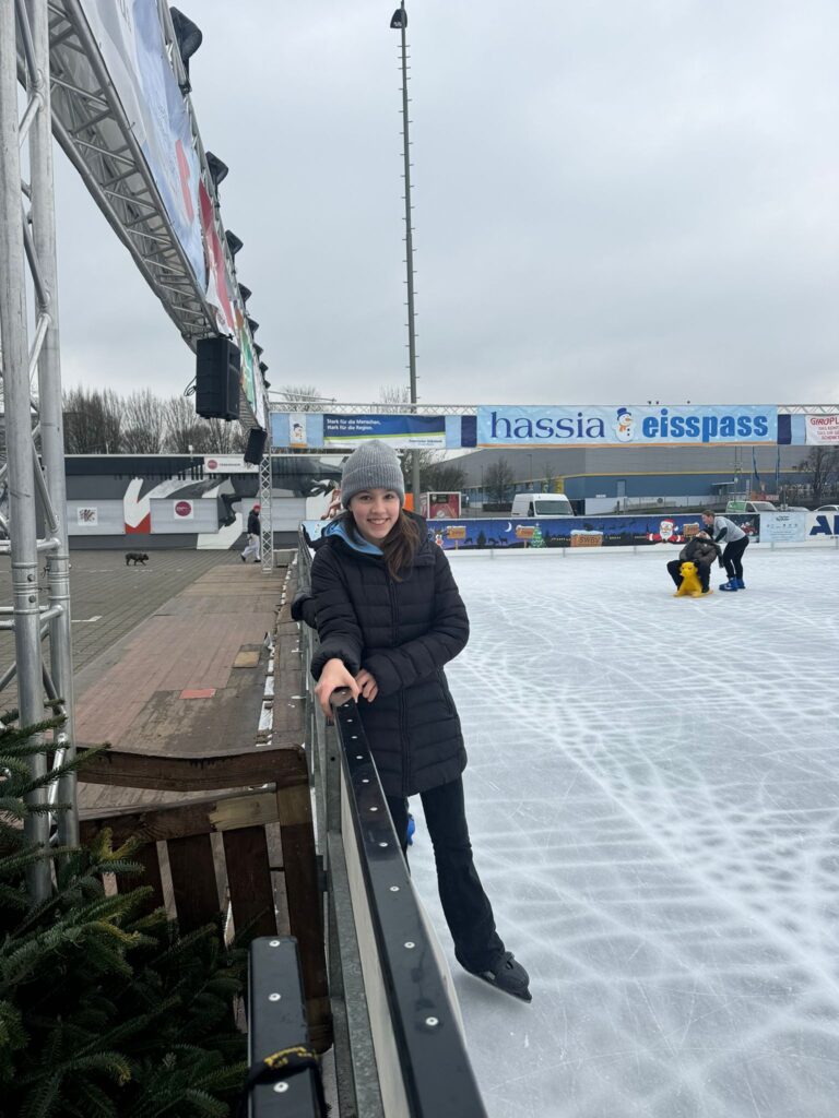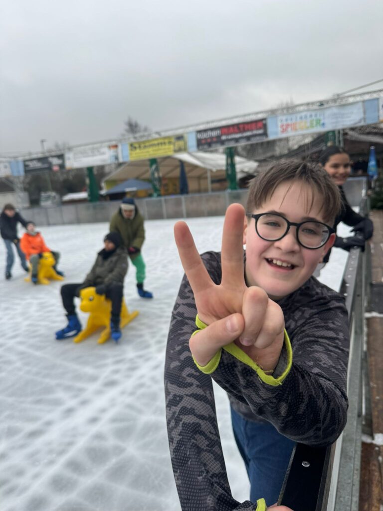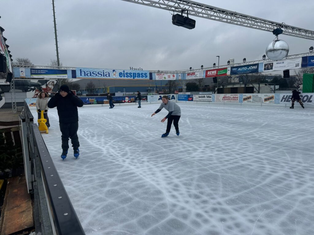 Am 18.12.25 war unsere Klasse auf der Eisbahn in Bad Vilbel. Die Eisbahn war extra am Vormittag nur für unsere Klasse geöffnet. Das war richtig cool, weil wir viel Platz hatten und alle Schlittschuh laufen konnten.