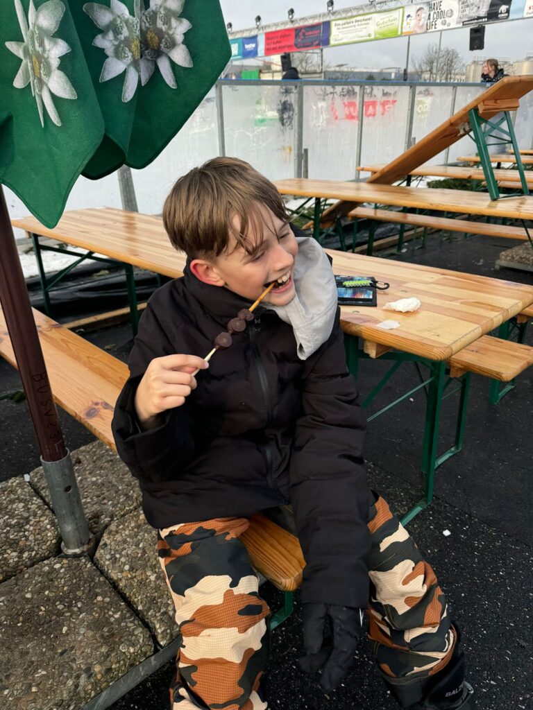 Wir hatten sehr viel Spaß, auch wenn manche öfter hingefallen sind. Danach haben sich viele von uns leckere Erdbeer-Schokospieße geholt. Außerdem gab es Automaten, in die man Münzen einwerfen konnte. Daraus kamen kleine Spielzeuge wie zum Beispiel Gummibälle.