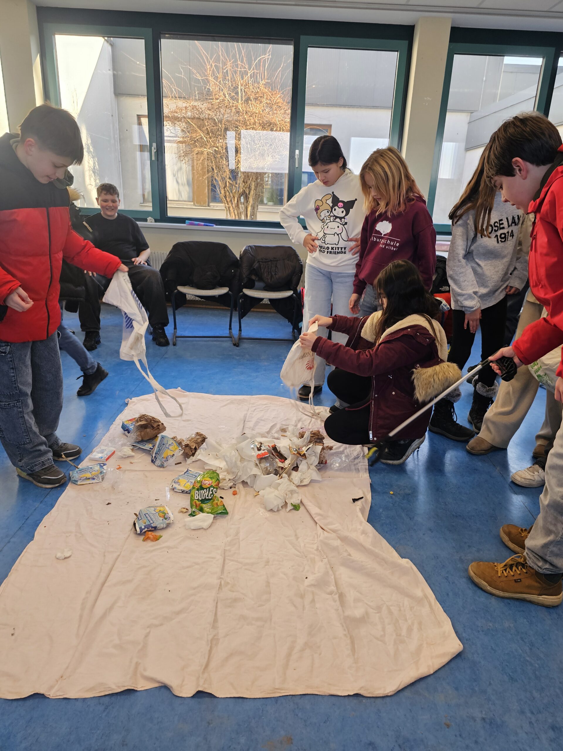 Zuerst ging es auf den Pausenhof. Hier durften wir mit Müllzangen und Stoffbeuteln das JFK-Schulgelände säubern. Anschließend entleeren wir die ganzen Taschen im Klassenraum auf ein vorbereitetes Tuch – ganz schön viel, was wir in wenigen Minuten, nach der großen Pause, einsammelten. Danach fanden wir zusammen mit Herrn Deller heraus, wie man unseren Schulhofmüll richtig trennt. Er hatte nämlich Miniatur-Mülltonnen dabei.